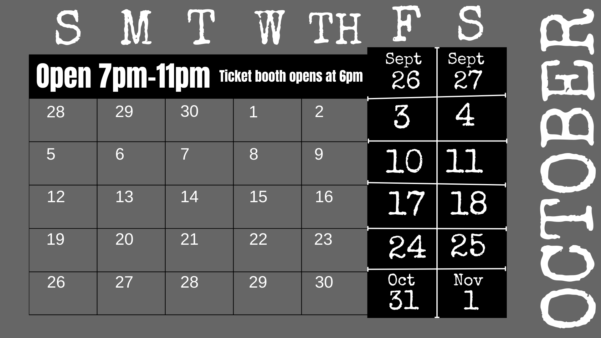 Open from Sept.26th to Nov.1st. Fridays & Saturdays only. Ticket booth opens at 6 pm. The doors are open from 7-11 pm. $25 per person. 2100 E. Liberty in Mexico, Missouri.